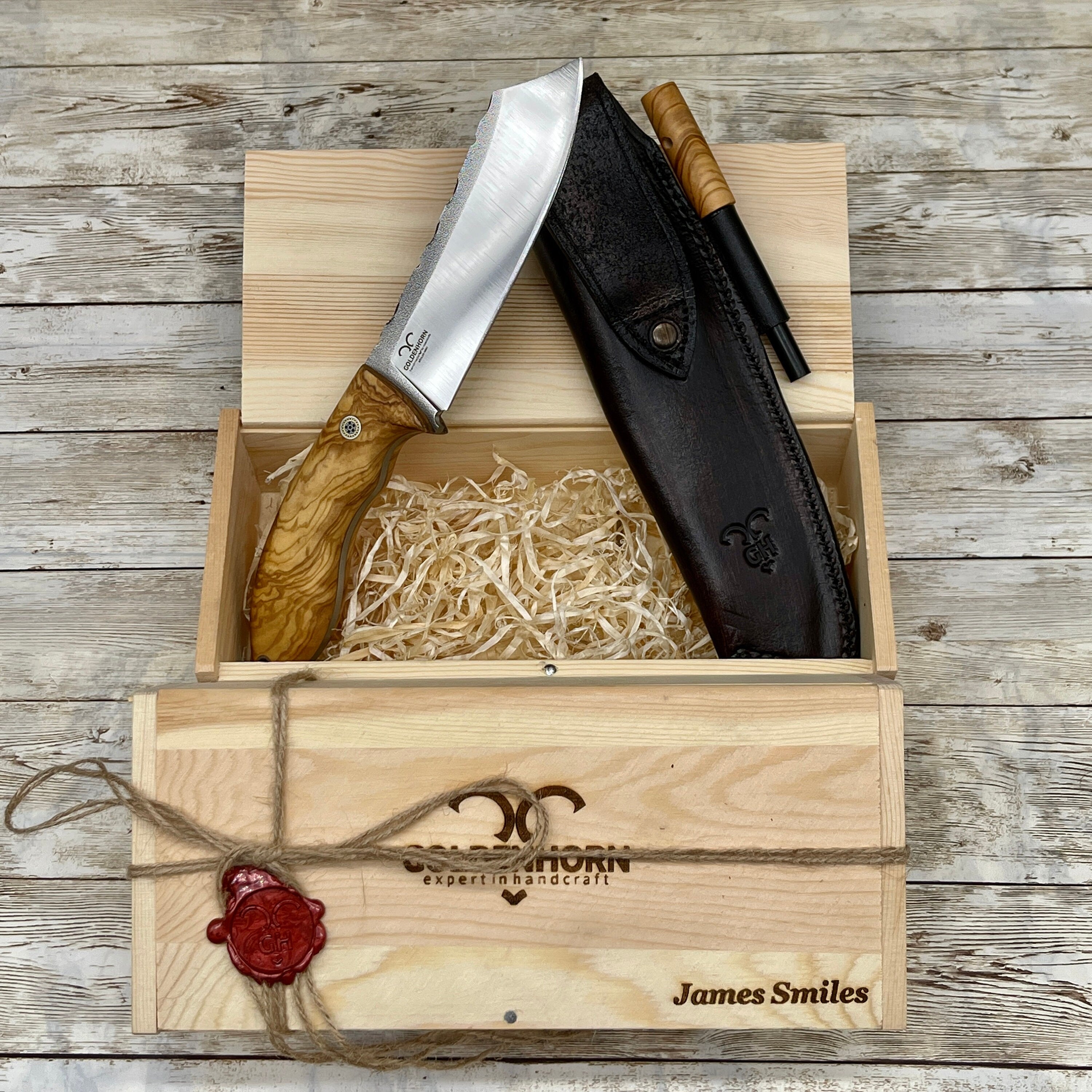 Meet the KILIMANJARO O — a handcrafted Böhler N690 camping knife featuring a razor-sharp stainless steel blade, olive wood handle, full back file work, and magnesium fire starter. Built for adventurers, hunters, and survivalists.