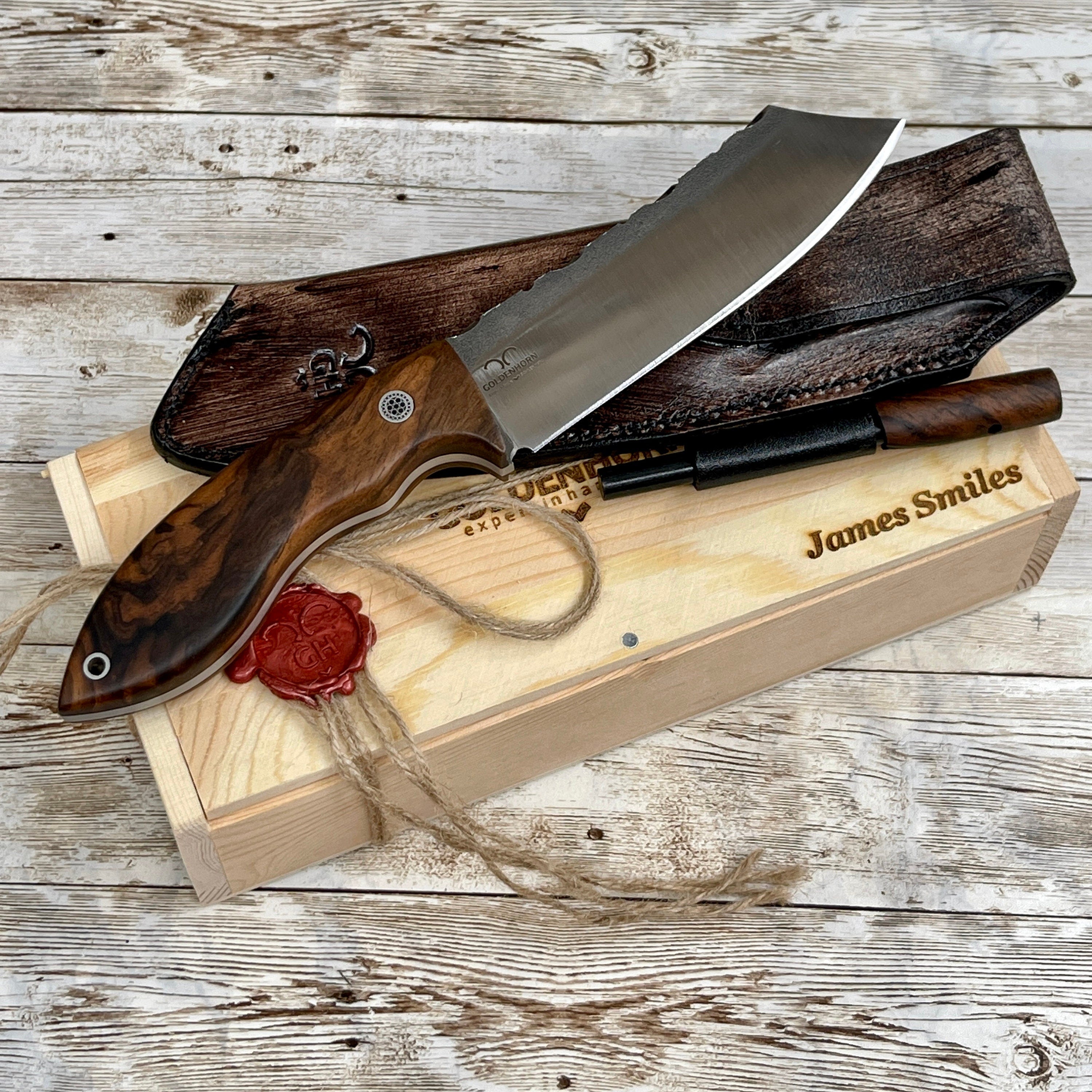 Camping Knife Turkish Olive Wood Tree Handle with Leather Sheath Hunting Knife Skinner Knife N690 Knife Bushcraft Knife Handmade N690 Stainless Steel Kilimanjaro Olive Wood Handle Hunting Knife with Leather Sheath, Professional Hunter Knife, Engraving to Sheath/Handle