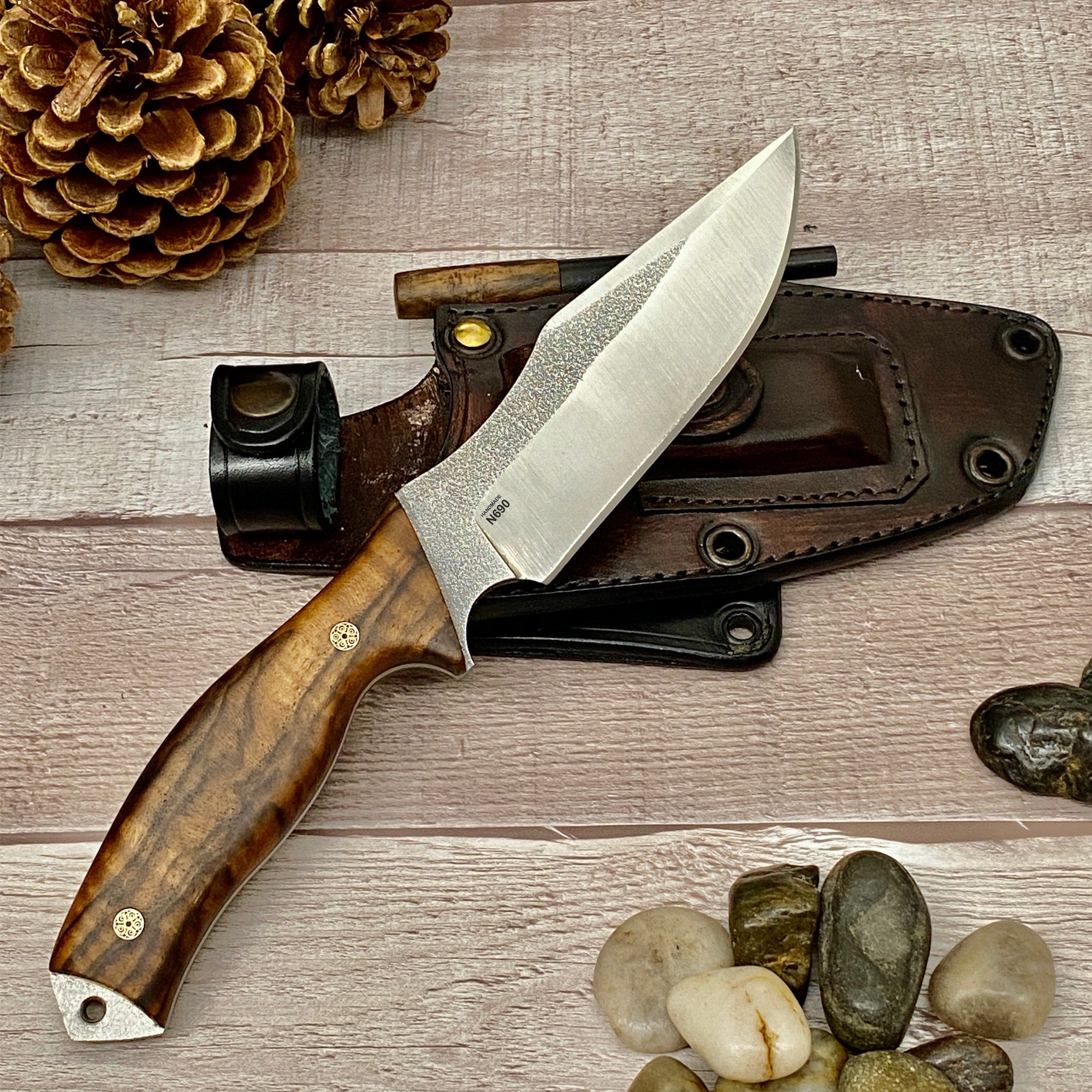 Tactical Knife with N690 Bohler Steel Walnut Handle and Leather Sheath Professional Knife with Laser Engraving Handle