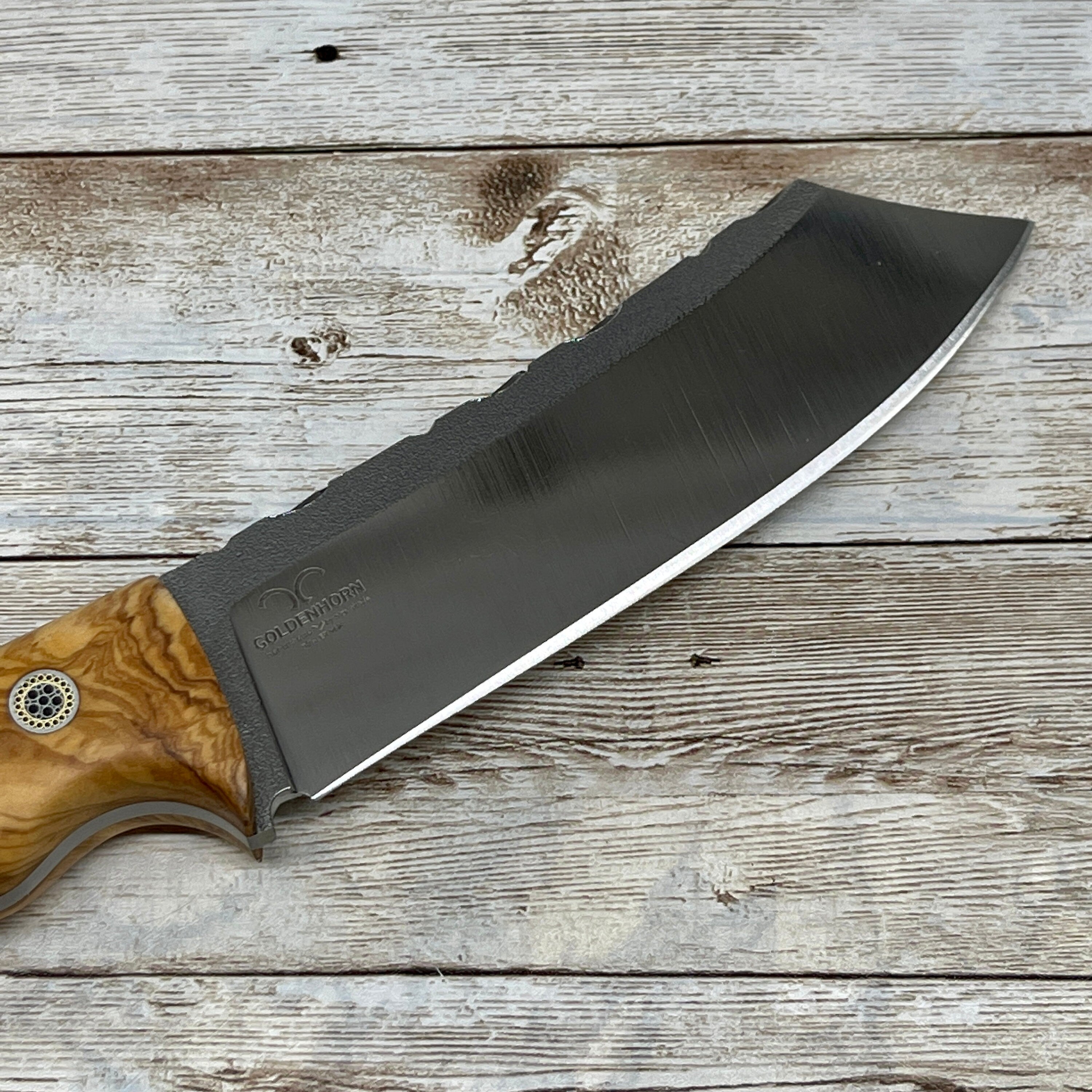 For Our Other Knives https://www.etsy.com/shop/GoldenHornOutdoor Features Quality leather case: We use 3mm thick leather to make a knife case that guarantees long-term storage for your knife. The sturdy leather case will not only keep your knife safe, but you will use it for many years. N690 stainless steel material: Our hardy knife's blade is made using N690 stainless steel, the upper version of Japanese steel. It's then heat-treated to 60-61 HRC. We also employ the 400 grit machine finish for the blade. The aftermath is a durable and strong knife immune to rusting and tough to break. Handle material: We use only natural materials such as walnut and olive trees for our handles. This is to ensure that our customers have safe handles.